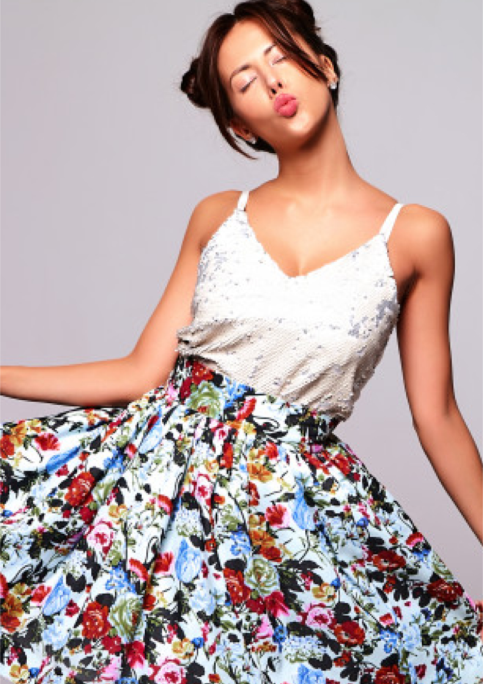 Black, off-white and peach-coloured _______ flared skirt, has zip _______,